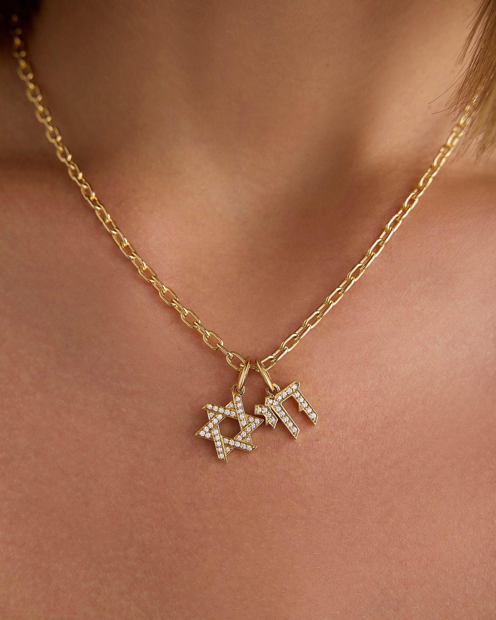 A symbol of life, reimagined in true Jennifer Fisher form. Crafted in solid 18k yellow gold and set with white pavé diamonds, the Chai charm is clean, powerful, and deeply personal. Wear it solo for quiet strength or layer it with your everyday favorites—this piece is made to live with you.