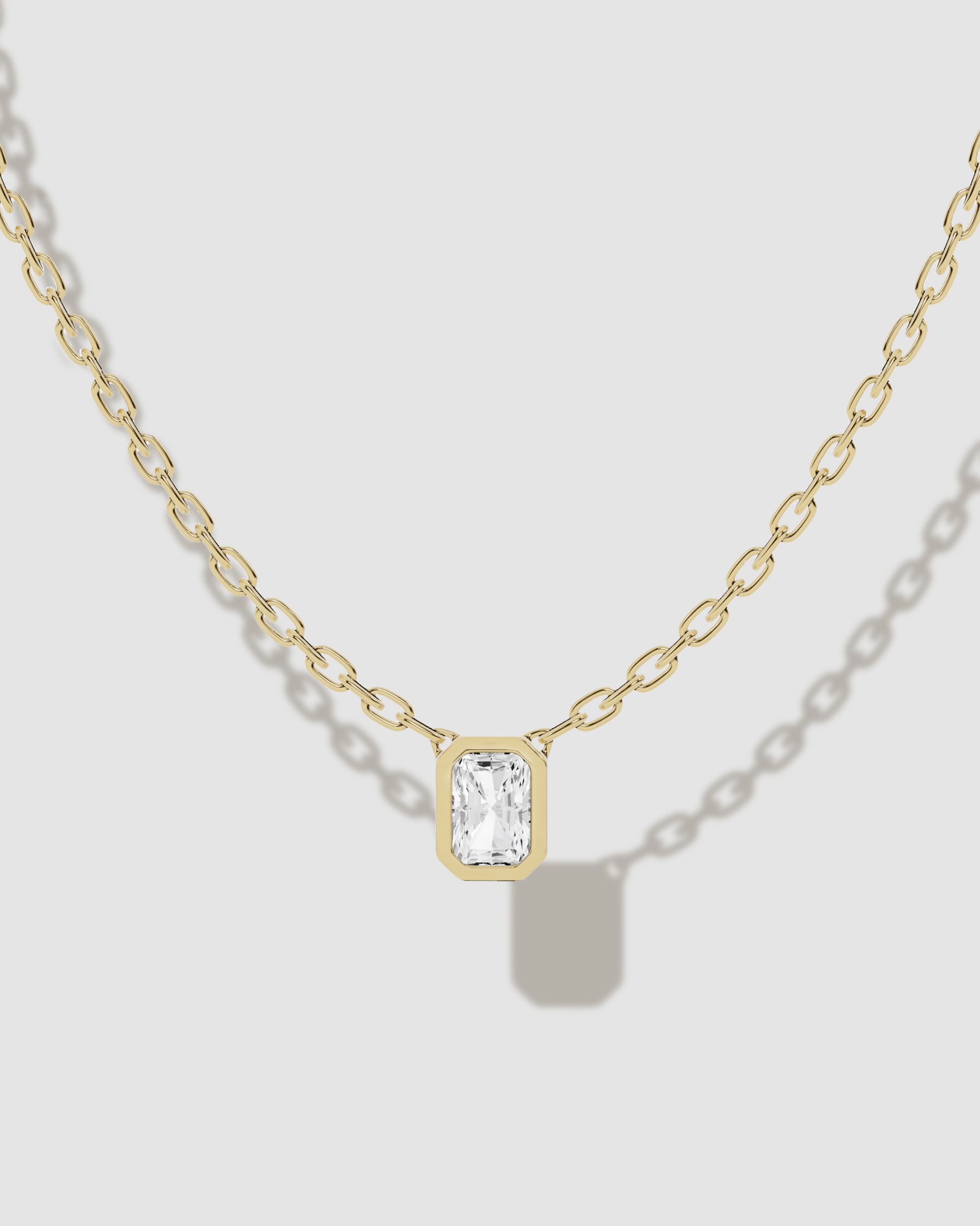 The Radiant Cut Vertical Solitaire Pendant is a not-so-subtle statement necklace that exudes sophistication. This bright and clear 0.50ct or 1.50ct lab diamond pendant is set in 18k Yellow Gold and will add a hit of sparkle to any look.