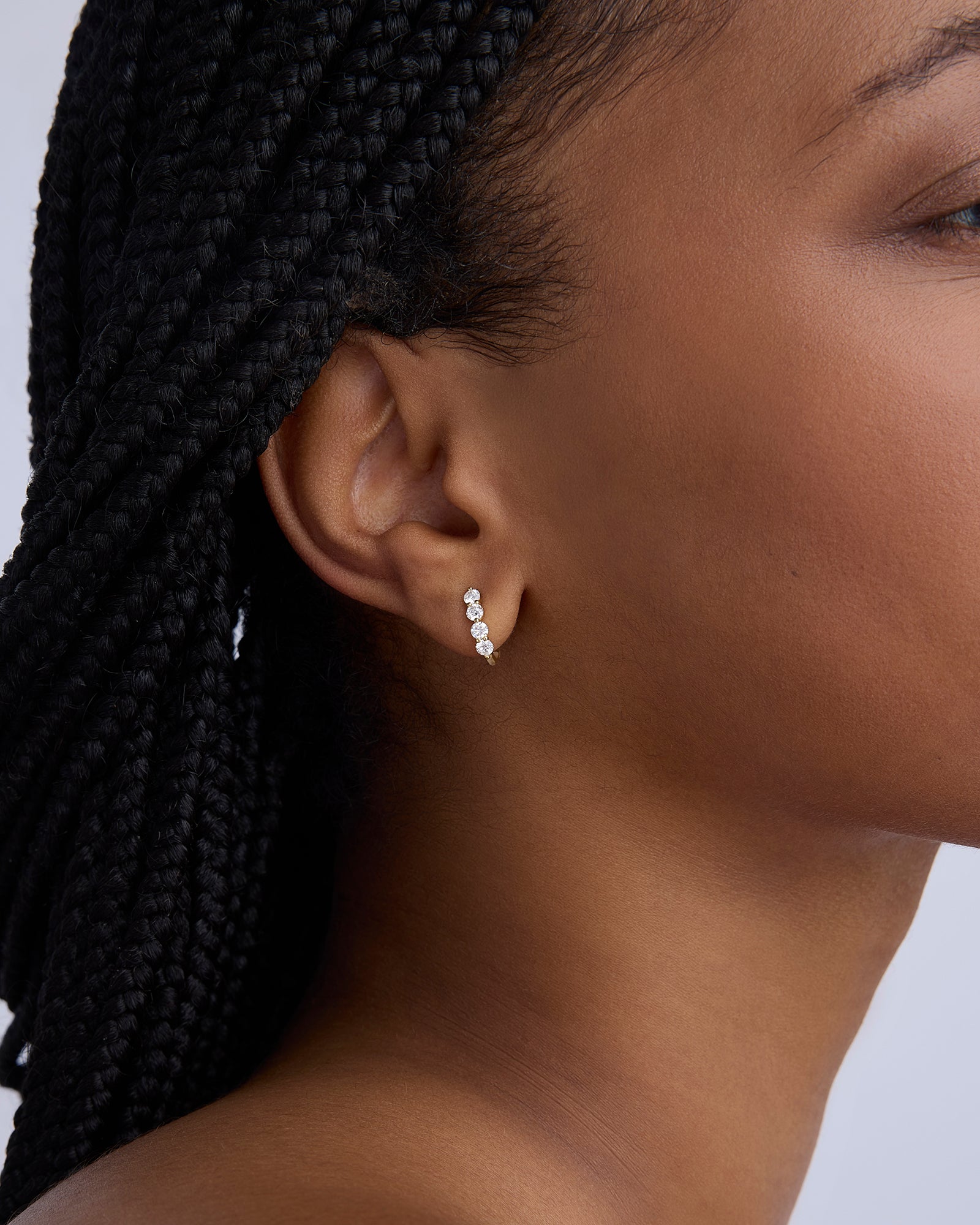 A client favorite, now reimagined with our signature floating diamond setting. This huggie features four bright white diamonds — minimal, sharp, and built to stack. Wear it solo or layer multiples for a stronger statement.