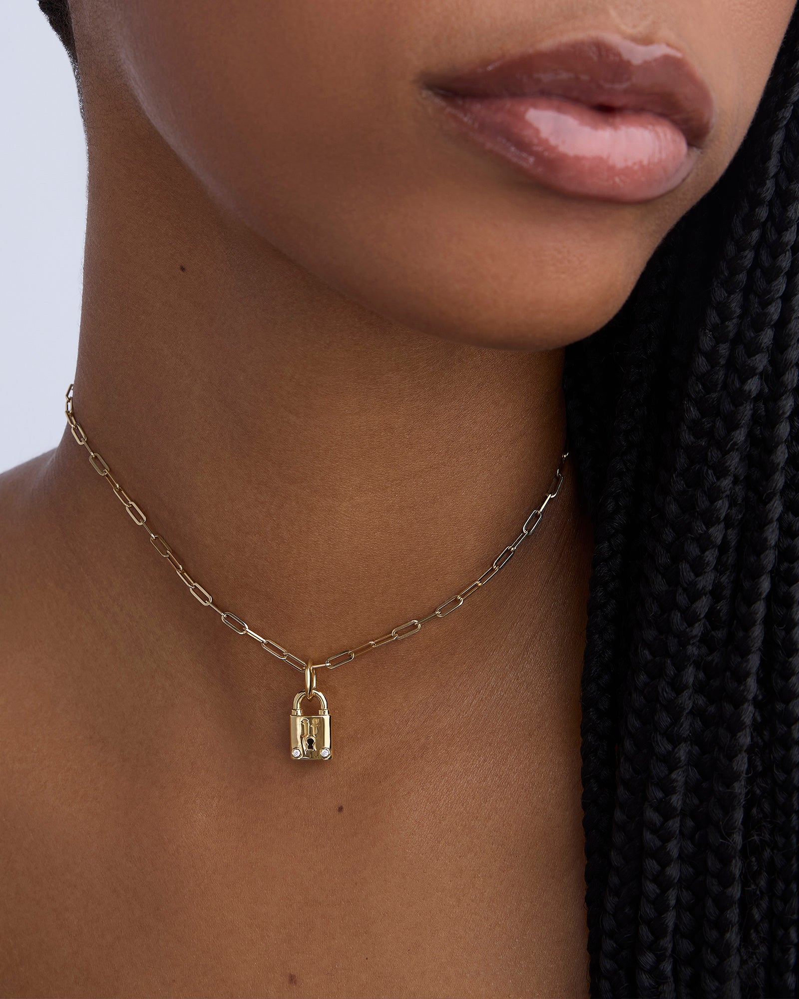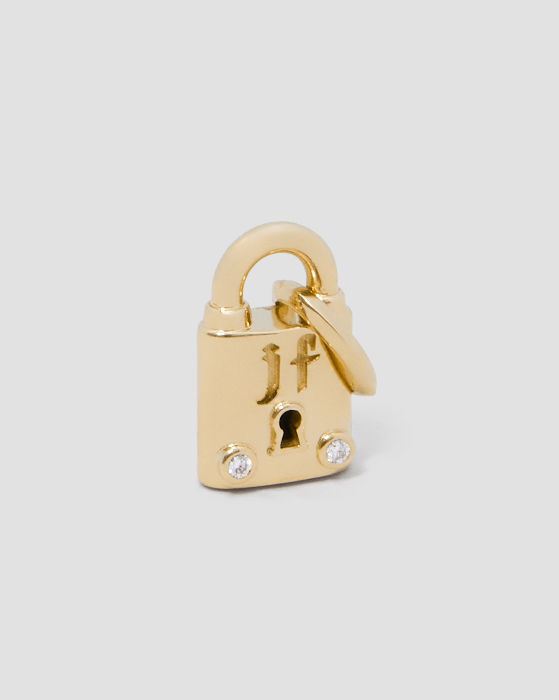 The Jennifer Fisher Small Lock with Two Diamonds is more than a charm — it’s strength and love, locked in. Two bright white diamonds add just the right edge. Ready to ship as is, or make it yours with up to two inset letters in Minimal Block or Gothic font. Your initials, your kids, someone who means everything. Please allow 5–8 weeks for personalization.
