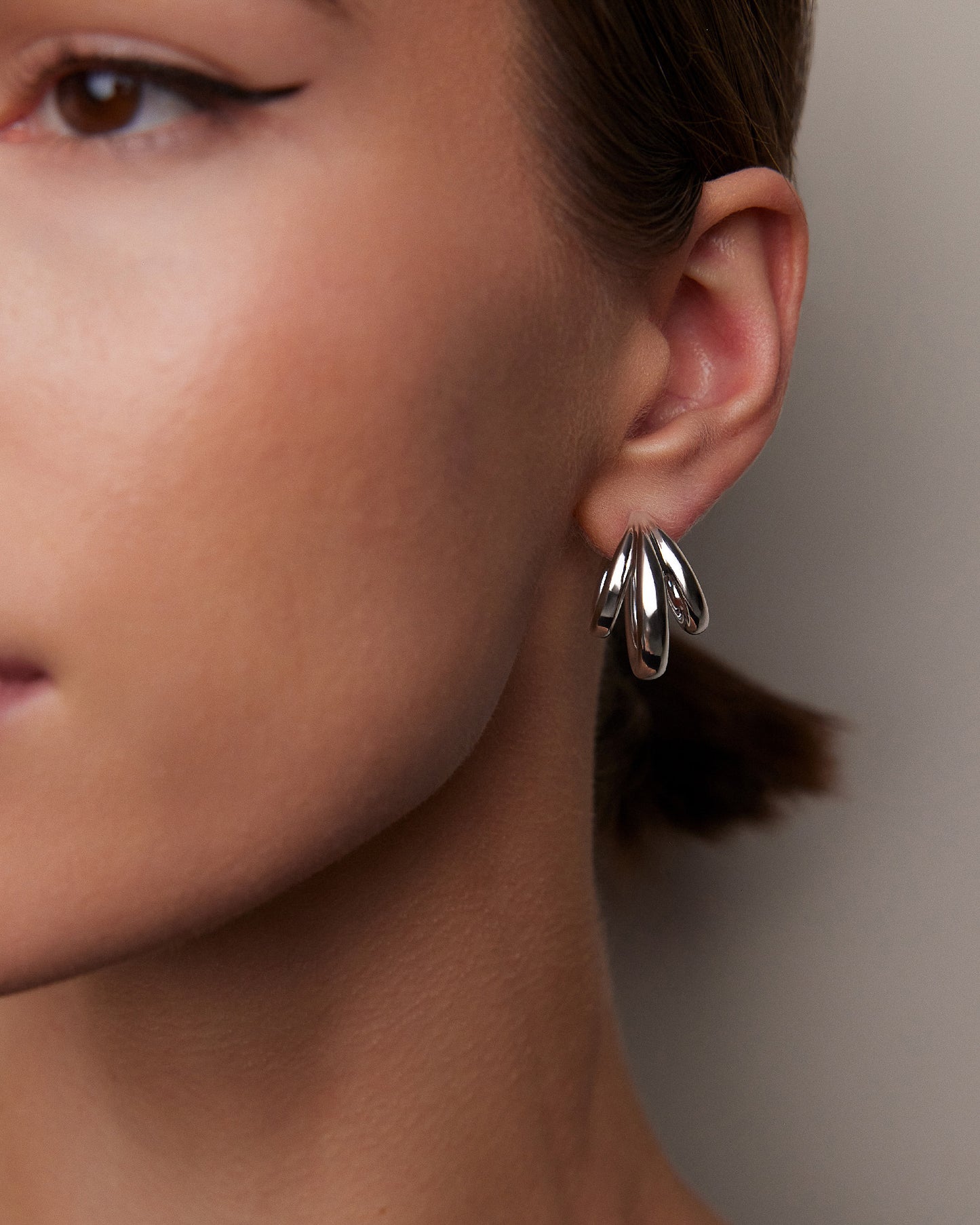 Named for Jennifer's grandmother Lillian, the Triple Lilly Huggie Hoops are an edgy three-dimensional take on Lilly Huggies. Sold as a pair.
